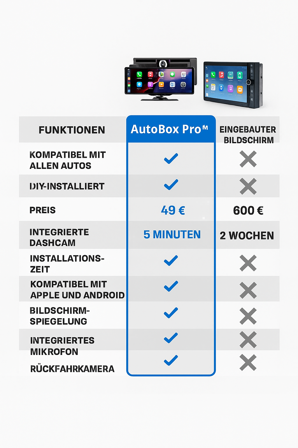 Sparen Sie Geld und treffen Sie die richtige Wahl! Warum 600 € für einen eingebauten Bildschirm ausgeben und Wochen auf die Installation warten, wenn Sie die AutoBox Pro™ in nur wenigen Minuten selbst installieren können – für nur 49 €?