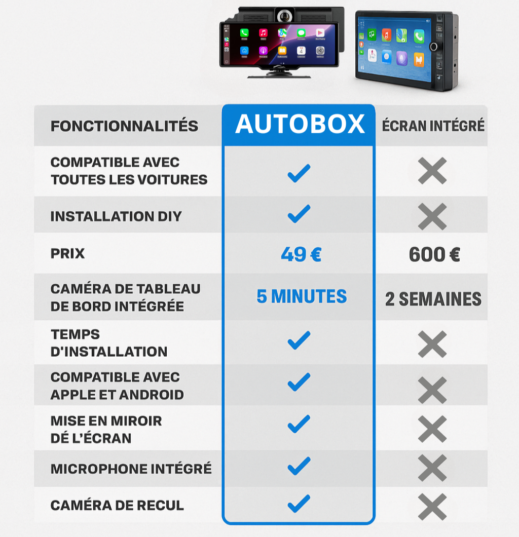Économisez de l'argent et faites le bon choix ! Pourquoi payer 600€ pour un écran intégré et attendre des semaines pour l'installation, alors que vous pouvez installer AutoBox Pro™ vous-même en quelques minutes – pour seulement 49€